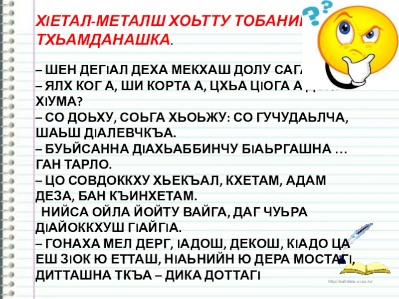 хIетал-металш хоьтту тобанийн тхьамданашка.  – Шен дегIал деха мекхаш долу сагалмат? ( – Ялх ког а,