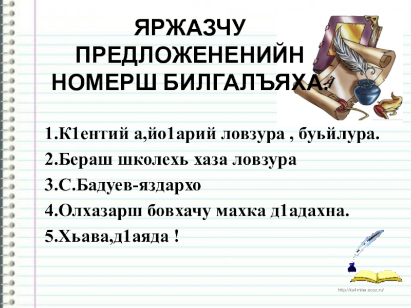 Яржазчу предложененийн номерш билгалъяха. 1.К1ентий а,йо1арий ловзура , буьйлура. 2.Бераш школехь хаза ловзура3.С.Бадуев-яздархо 4.Олхазарш бовхачу махка д1адахна.