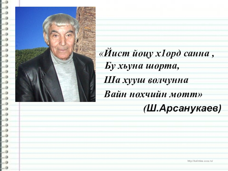 «Йист йоцу х1орд санна , Бу хьуна шорта, Ша хууш волчунна Вайн нохчийн мотт»(Ш.Арсанукаев)