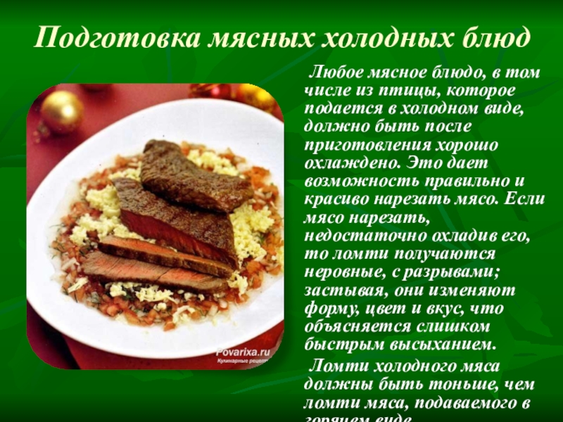 которое подается в холодном виде, должно быть после приготовления хорошо охлаждено. Это дает возможность правильно и красиво нарезать мясо. Если мясо нарезать, недостаточно охладив его, то ломти получаются неровные, с разрывами; застывая, они изменяют форму, цвет и вкус, что объясняется слишком быстрым высыханием.