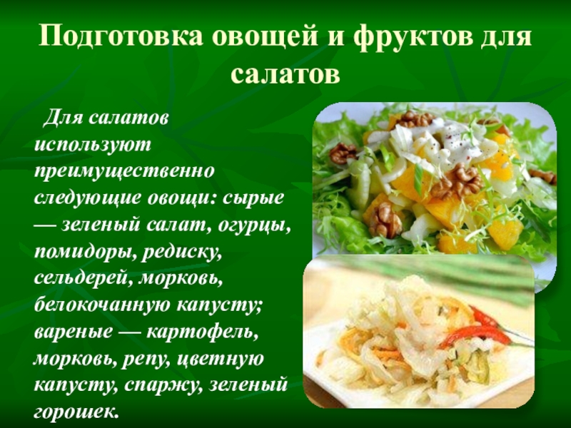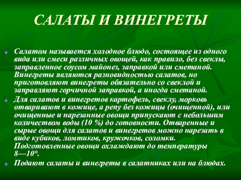 Для салатов и винегретов картофель, свеклу, морковь отваривают в кожице, а репу без кожицы (очищенной), или очищенные и нарезанные овощи припускают с небольшим количеством воды (10 %) до готовности. Отваренные и сырые овощи для салатов и винегретов можно нарезать в виде кубиков, ломтиков, кружочков, соломки. Подготовленные овощи охлаждают до температуры 8—10°.
