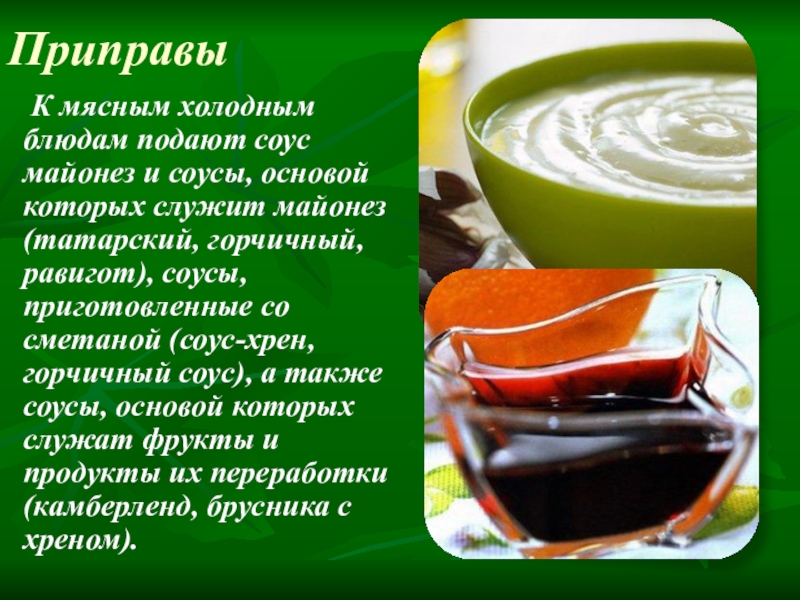К мясным холодным блюдам подают соус майонез и соусы, основой