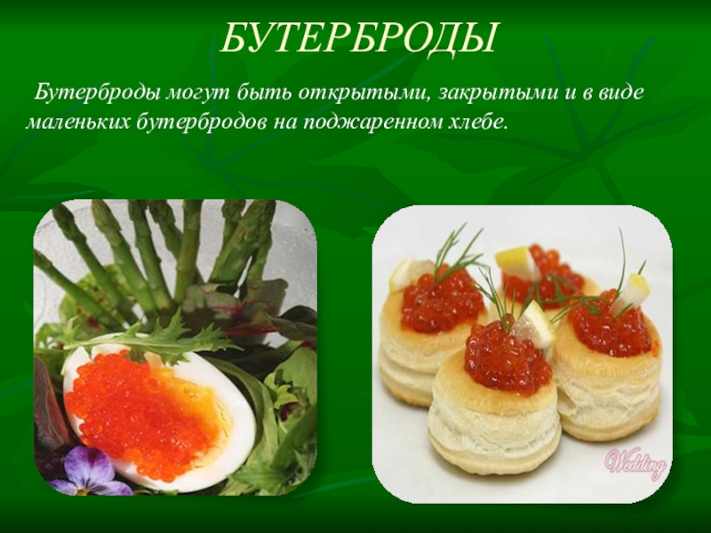 Слайд 6 Бутерброды могут быть открытыми, закрытыми и в виде маленьких бутербродов