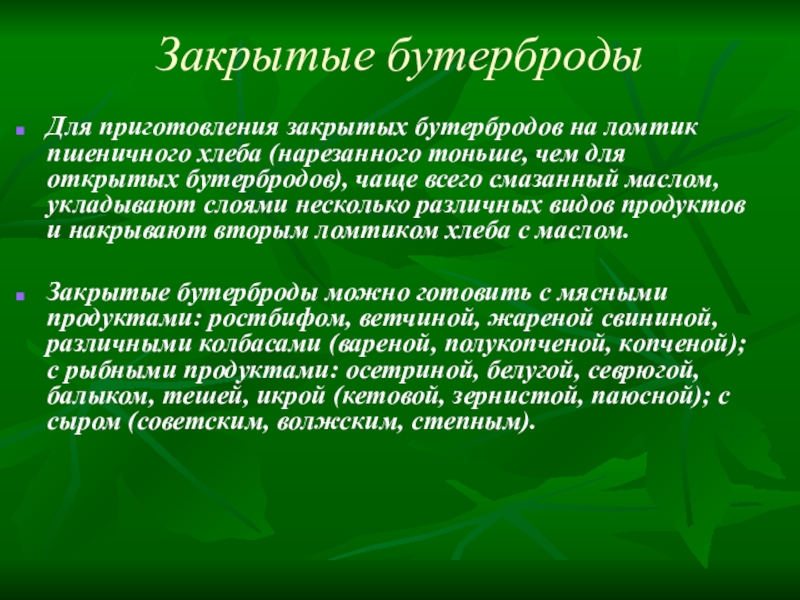 Закрытые бутерброды можно готовить с мясными продуктами: ростбифом, ветчиной, жареной свининой, различными колбасами (вареной, полукопченой, копченой); с рыбными продуктами: осетриной, белугой, севрюгой, балыком, тешей, икрой (кетовой, зернистой, паюсной); с сыром (советским, волжским, степным).