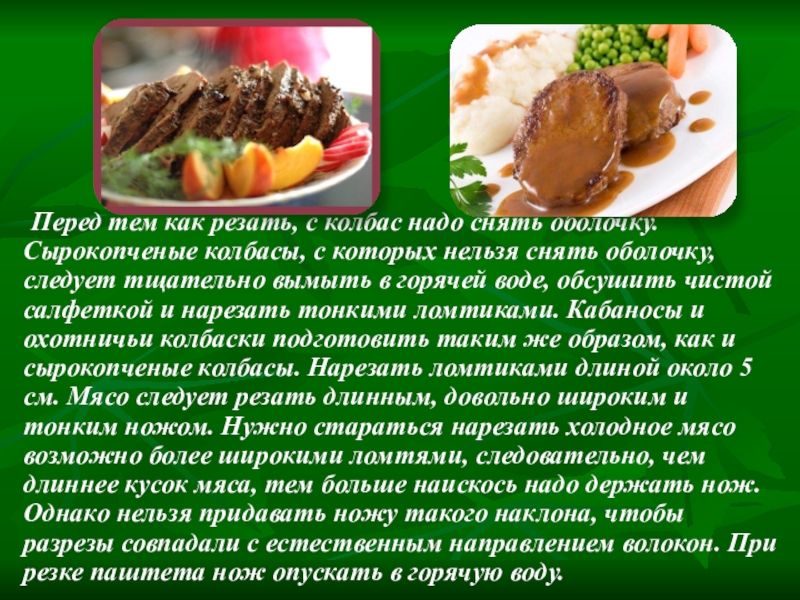 с которых нельзя снять оболочку, следует тщательно вымыть в горячей воде, обсушить чистой салфеткой и нарезать тонкими ломтиками. Кабаносы и охотничьи колбаски подготовить таким же образом, как и сырокопченые колбасы. Нарезать ломтиками длиной около 5 см. Мясо следует резать длинным, довольно широким и тонким ножом. Нужно стараться нарезать холодное мясо возможно более широкими ломтями, следовательно, чем длиннее кусок мяса, тем больше наискось надо держать нож. Однако нельзя придавать ножу такого наклона, чтобы разрезы совпадали с естественным направлением волокон. При резке паштета нож опускать в горячую воду.