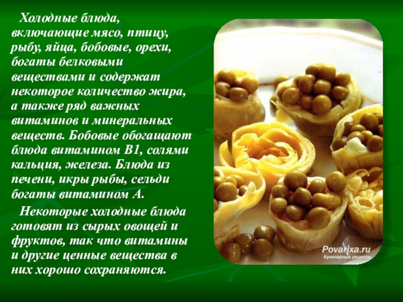 Слайд 3Холодные блюда, включающие мясо, птицу, рыбу, яйца, бобовые, орехи, богаты белковыми