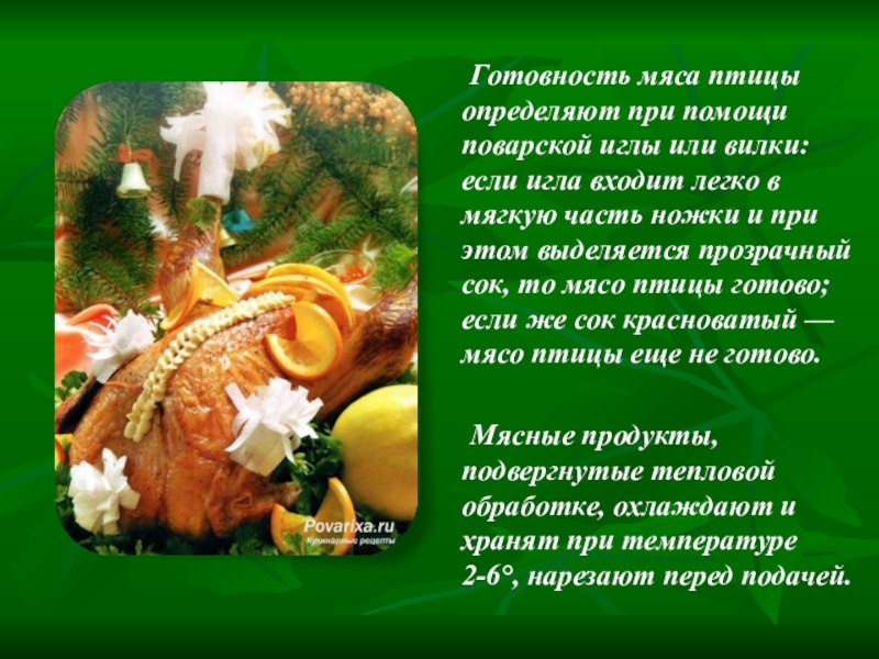 Слайд 13Готовность мяса птицы определяют при помощи поварской иглы или вилки: если