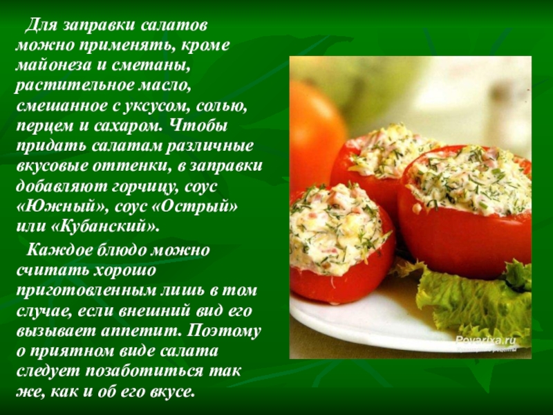 Слайд 16Для заправки салатов можно применять, кроме майонеза и сметаны, растительное масло,