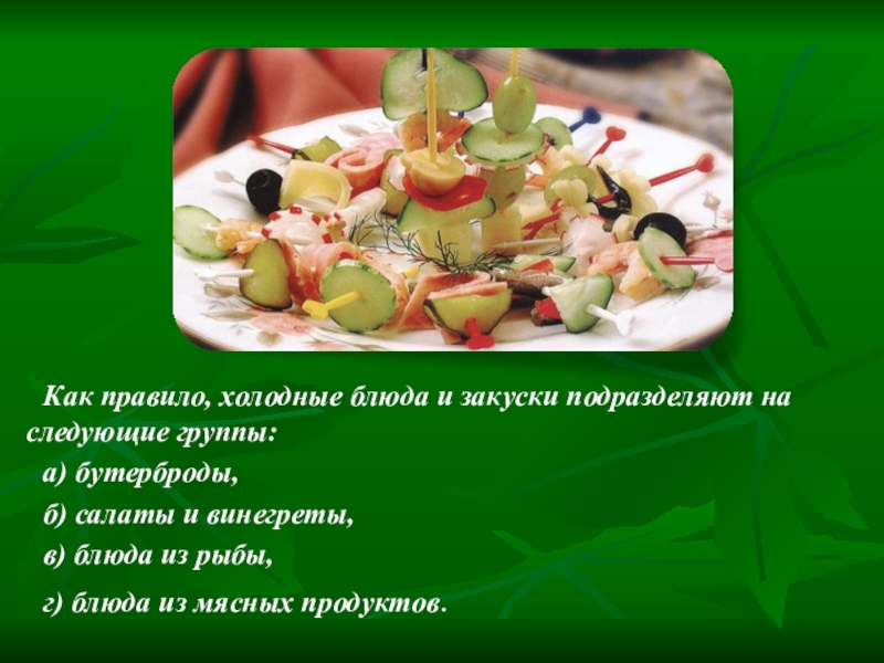 Слайд 5Как правило, холодные блюда и закуски подразделяют на следующие группы: