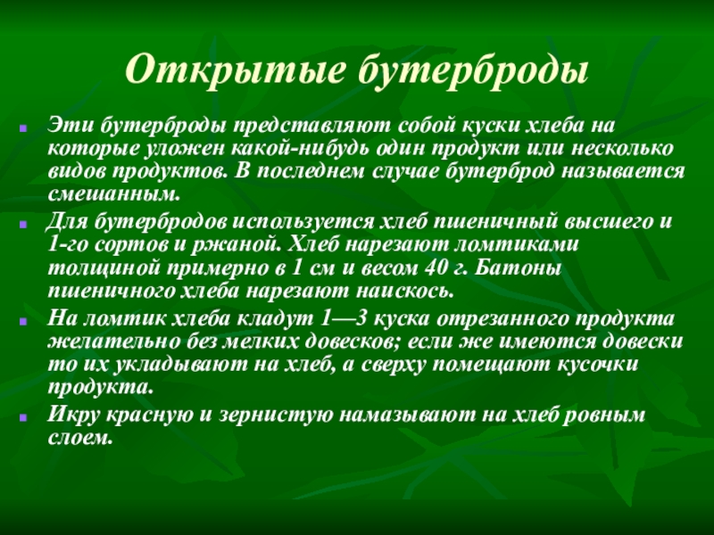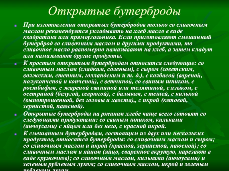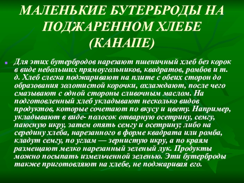 без корок в виде небольших прямоугольников, квадратов, ромбов и т. д. Хлеб слегка поджаривают на плите с обеих сторон до образования золотистой корочки, охлаждают, после чего смазывают с одной стороны сливочным маслом. На подготовленный хлеб укладывают несколько видов продуктов, которые сочетают по вкусу и цвету. Например, укладывают в виде- полосок отварную осетрину, семгу, паюсную икру, затем опять семгу и осетрину; либо на середину хлеба, нарезанного в форме квадрата или ромба, кладут семгу, по углам — зернистую икру, а по краям размещают мелко нарезанный зеленый лук. Продукты можно посыпать измельченной зеленью. Эти бутерброды также приготовляют на хлебе, не поджаривая его.