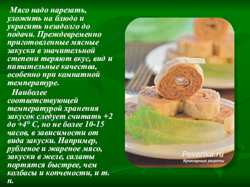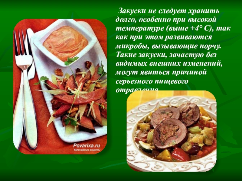 Слайд 20Закуски не следует хранить долго, особенно при высокой температуре (выше +4°