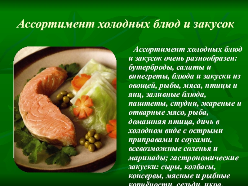 бутерброды, салаты и винегреты, блюда и закуски из овощей, рыбы, мяса, птицы и яиц, заливные блюда, паштеты, студни, жареные и отварные мясо, рыба, домашняя птица, дичь в холодном виде с острыми приправами и соусами, всевозможные соленья и маринады; гастрономические закуски: сыры, колбасы, консервы, мясные и рыбные копчёности, сельди, икра.