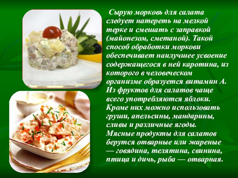 Слайд 15Сырую морковь для салата следует натереть на мелкой терке и смешать