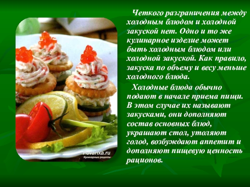 Слайд 2Четкого разграничения между холодным блюдом и холодной закуской нет. Одно и