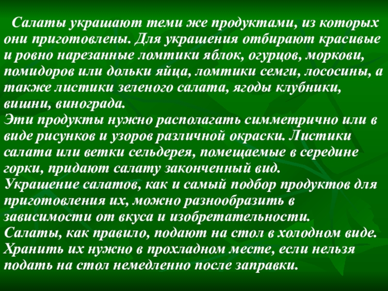 Слайд 21Салаты украшают теми же продуктами, из которых они приготовлены. Для украшения