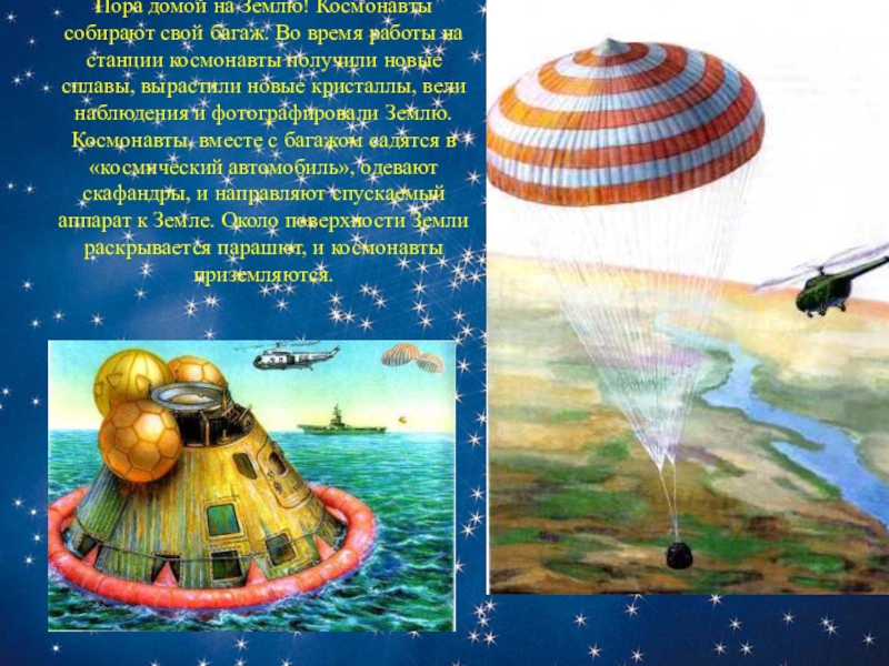на станции космонавты получили новые сплавы, вырастили новые кристаллы, вели наблюдения и фотографировали Землю. Космонавты, вместе с багажом садятся в «космический автомобиль», одевают скафандры, и направляют спускаемый аппарат к Земле. Около поверхности Земли раскрывается парашют, и космонавты приземляются.