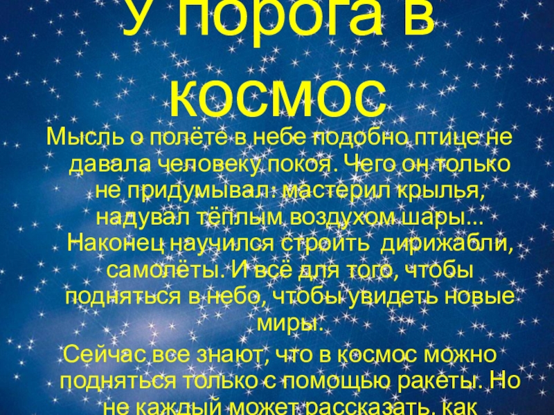 давала человеку покоя. Чего он только не придумывал: мастерил крылья, надувал тёплым воздухом шары... Наконец научился строить дирижабли, самолёты. И всё для того, чтобы подняться в небо, чтобы увидеть новые миры.