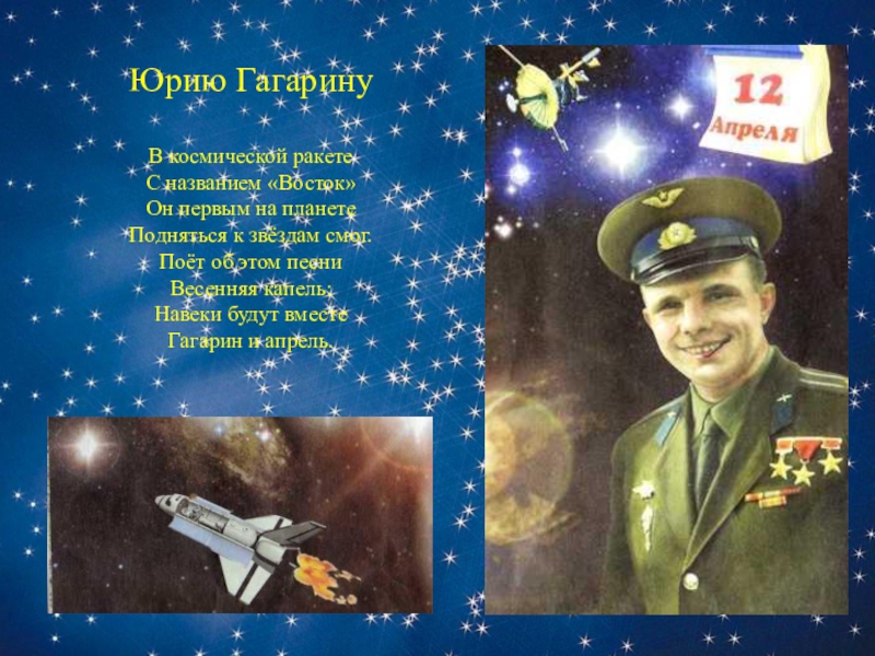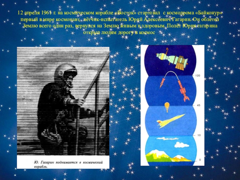 «Байконур» первый в мире космонавт, лётчик-испытатель Юрий Алексеевич Гагарин. Он облетел Землю всего один раз, вернулся на Землю живым и здоровым. Полёт Юрия гагарина открыл людям дорогу в космос.