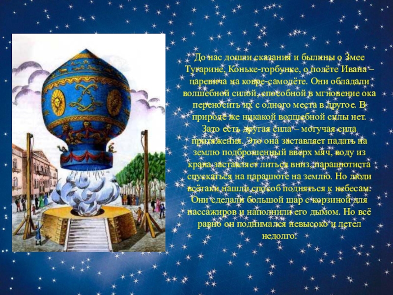 полёте Ивана –царевича на ковре-самолёте. Они обладали волшебной силой, способной в мгновение ока переносить их с одного места в другое. В природе же никакой волшебной силы нет. Зато есть другая сила – могучая сила притяжения. Это она заставляет падать на землю подброшенный вверх мяч, воду из крана заставляет литься вниз, парашютиста спускаться на парашюте на землю. Но люди всётаки нашли способ подняться к небесам. Они сделали большой шар с корзиной для пассажиров и наполнили его дымом. Но всё равно он поднимался невысоко и летел недолго.