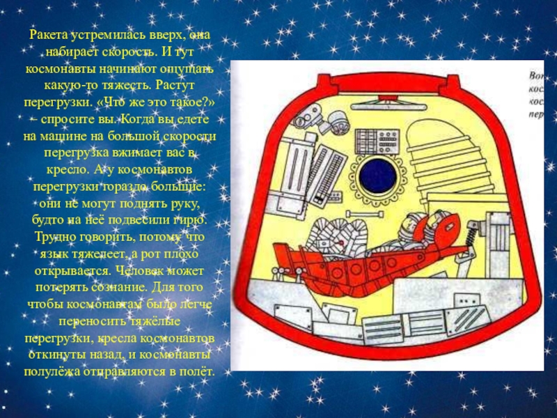 какую-то тяжесть. Растут перегрузки. «Что же это такое?» – спросите вы. Когда вы едете на машине на большой скорости перегрузка вжимает вас в кресло. А у космонавтов перегрузки гораздо большие: они не могут поднять руку, будто на неё подвесили гирю. Трудно говорить, потому что язык тяжелеет, а рот плохо открывается. Человек может потерять сознание. Для того чтобы космонавтам было легче переносить тяжёлые перегрузки, кресла космонавтов откинуты назад, и космонавты полулёжа отправляются в полёт.