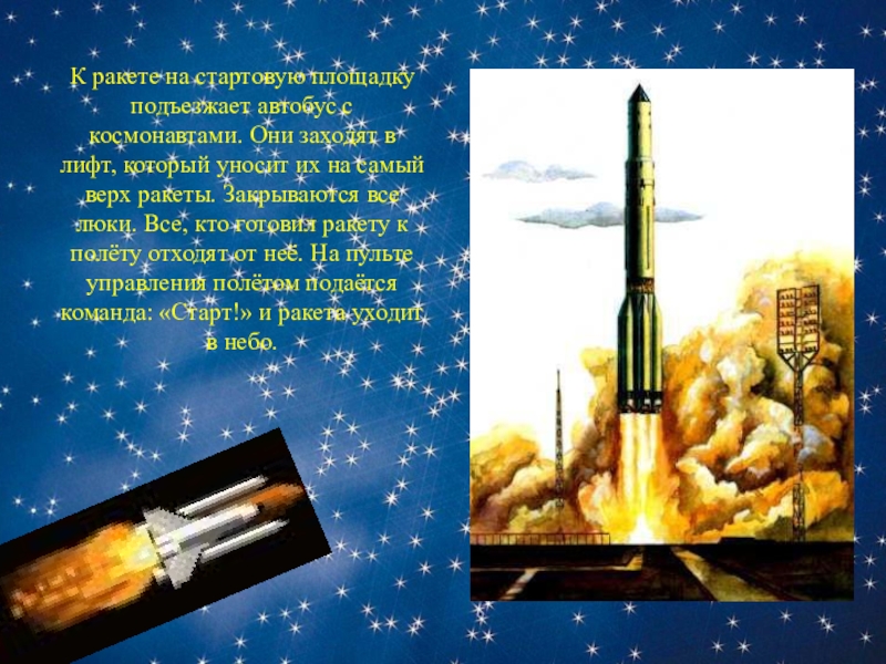 Слайд 11К ракете на стартовую площадку подъезжает автобус с космонавтами. Они заходят