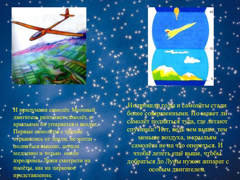 самолёт подняться туда, где летают спутники? Нет, ведь чем выше, тем меньше воздуха, и крыльям самолёта не на что опереться. И чтобы лететь ещё выше, чтобы добраться до Луны нужен аппарат с особым двигателем.