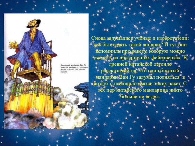 тут они вспомнили про ракету, которую можно увидеть на праздничных фейерверках. В древней китайской легенде рассказывается, что один богатый мандарин Ван Гу задумал подняться в воздух с помощью связки таких ракет. С тех пор китайского мандарина никто больше не видел.