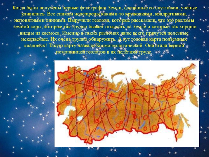 Все снимки испещрены какими-то кружочками, квадратиками, непонятными линиями. Выручили геологи, которые рассказали, что это разломы земной коры, которые так трудно бывает отыскать на Земле и которые так хорошо видны из космоса. Именно в таких разломах чаще всего прячутся полезные ископаемые. Их очень трудно обнаружить. А тут готовая карта подземных кладовых! Такую карту назвали Космогеологической. Она стала верной помощницей геологов в их нелёгком труде.