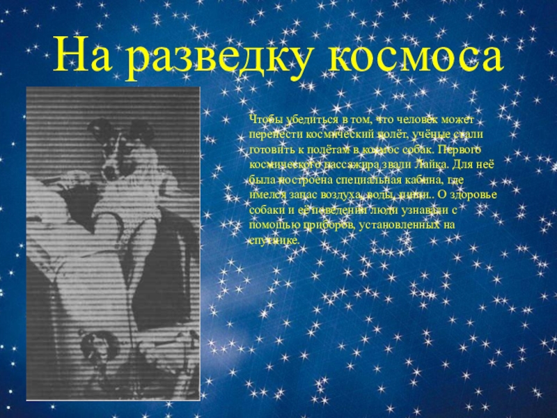 стали готовить к полётам в космос собак. Первого космического пассажира звали Лайка. Для неё была построена специальная кабина, где имелся запас воздуха, воды, пищи.. О здоровье собаки и её поведении люди узнавали с помощью приборов, установленных на спутнике.