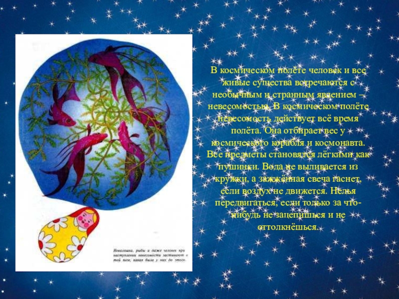 и странным явлением – невесомостью. В космическом полёте невесомость действует всё время полёта. Она отбирает вес у космического корабля и космонавта. Все предметы становятся лёгкими как пушинки. Вода не выливается из кружки, а зажжённая свеча гаснет, если воздух не движется. Нелья передвигаться, если только за что-нибудь не зацепишься и не оттолкнёшься.