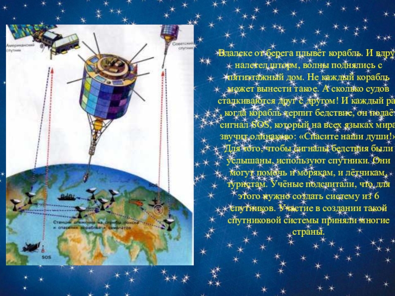 с пятиэтажный дом. Не каждый корабль может вынести такое. А сколько судов сталкиваются друг с другом! И каждый раз , когда корабль терпит бедствие, он подаёт сигнал SOS, который на всех языках мира звучит одинаково: «Спасите наши души!»Для того, чтобы сигналы бедствия были услышаны, используют спутники. Они могут помочь и морякам, и лётчикам, туристам. Учёные подсчитали, что для этого нужно создать систему из 6 спутников. Участие в создании такой спутниковой системы приняли многие страны.