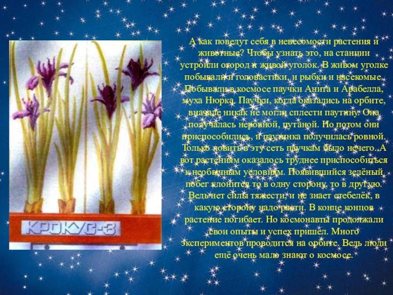 это, на станции устроили огород и живой уголок. В живом уголке побывали и головастики, и рыбки и насекомые. Побывали в космосе паучки Анита и Арабелла, муха Нюрка. Паучки, когда оказались на орбите, вначале никак не могли сплести паутину. Она получалась неровной, путаной. Но потом они приспособились, и паутинка получилась ровной. Только ловить в эту сеть паучкам было нечего. А вот растениям оказалось труднее приспособиться к необычным условиям. Появившийся зелёный побег клонится то в одну сторону, то в другую. Ведь нет силы тяжести, и не знает стебелёк, в какую сторону надо расти. В конце концов растение погибает. Но космонавты продолжали свои опыты и успех пришел. Много экспериментов проводится на орбите. Ведь люди ещё очень мало знают о космосе.