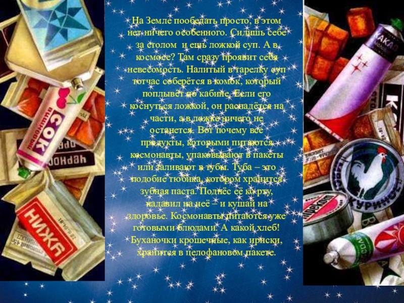 за столом и ешь ложкой суп. А в космосе? Там сразу проявит себя невесомость. Налитый в тарелку суп тотчас соберётся в комок, который поплывёт по кабине. Если его коснуться ложкой, он распадётся на части, а в ложке ничего не останется. Вот почему все продукты, которыми питаются космонавты, упаковывают в пакеты или заливают в тубы. Туба – это подобие тюбика, котором хранится зубная паста. Поднёс её ко рту, надавил на неё – и кушай на здоровье. Космонавты питаются уже готовыми блюдами. А какой хлеб! Буханочки крошечные, как ириски, хранится в целофановом пакете.