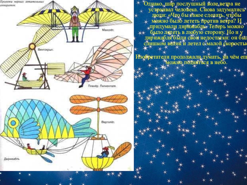 «Что бы такое сделать, чтобы можно было лететь против ветра? И придумали дирижабль. Теперь можно было лететь в любую сторону. Но и у дирижабля были свои недостатки: он был слишком велик и летел с малой скоростью.