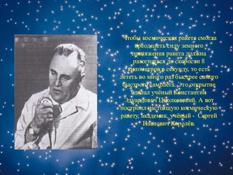 разогнаться до скорости 8 километров в секунду, то есть лететь во много раз быстрее самого быстрого самолёта. Это открытие сделал учёный Константин Эдуардович Циолковский. А вот построил настоящую космическую ракету, академик, учёный - Сергей Павлович Королёв.