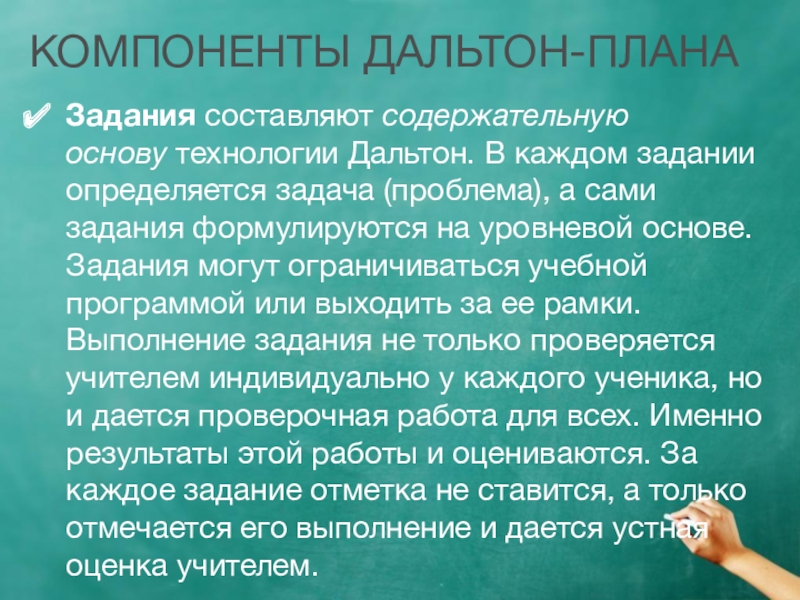 Задания составляют содержательную основу технологии Дальтон. В каждом задании определяется задача (проблема), а