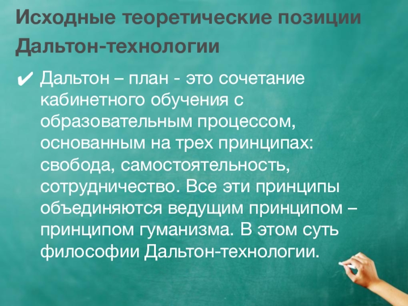с образовательным процессом, основанным на трех принципах: свобода, самостоятельность, сотрудничество. Все эти принципы объединяются ведущим принципом – принципом гуманизма. В этом суть философии Дальтон-технологии.