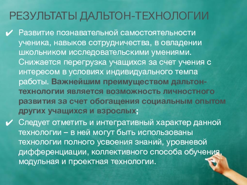 умениями. Снижается перегрузка учащихся за счет учения с интересом в условиях индивидуального темпа работы. Важнейшим преимуществом дальтон-технологии является возможность личностного развития за счет обогащения социальным опытом других учащихся и взрослых;