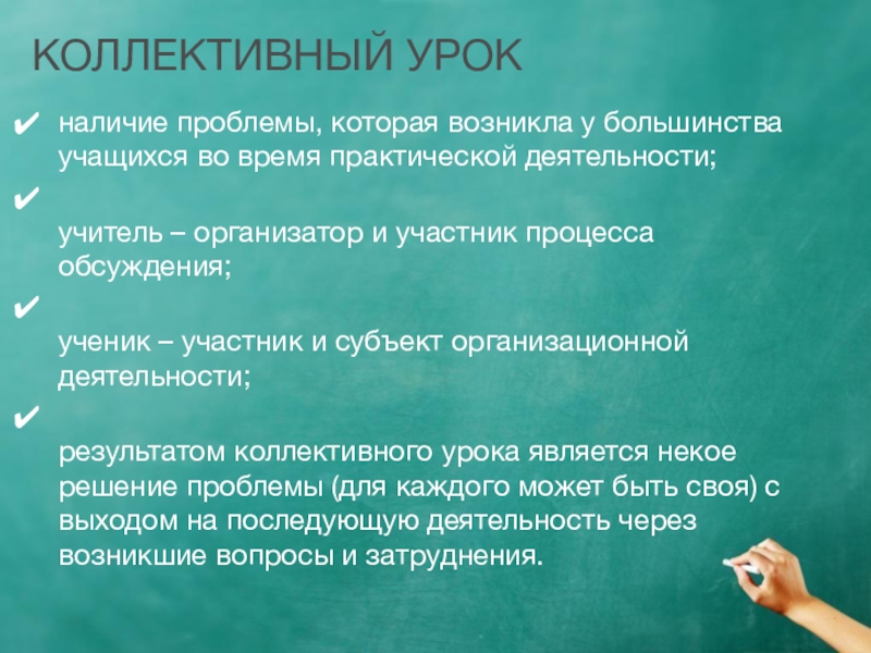 результатом коллективного урока является некое решение проблемы (для каждого может быть своя) с выходом на последующую деятельность через возникшие вопросы и затруднения.