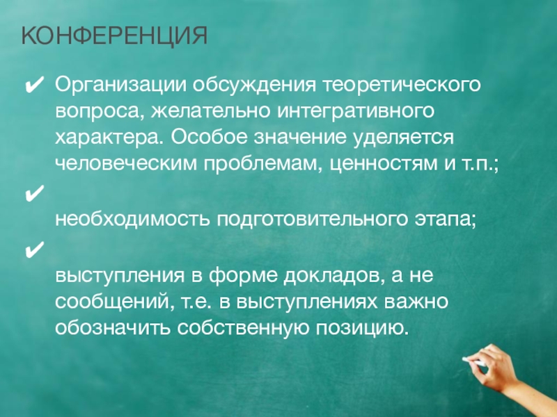 Организации обсуждения теоретического вопроса, желательно интегративного характера. Особое значение уделяется человеческим