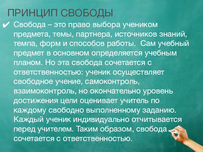знаний, темпа, форм и способов работы. Сам учебный предмет в основном определяется учебным планом. Но эта свобода сочетается с ответственностью: ученик осуществляет свободное учение, самоконтроль, взаимоконтроль, но окончательно уровень достижения цели оценивает учитель по каждому свободно выполненному заданию. Каждый ученик индивидуально отчитывается перед учителем. Таким образом, свобода сочетается с ответственностью.