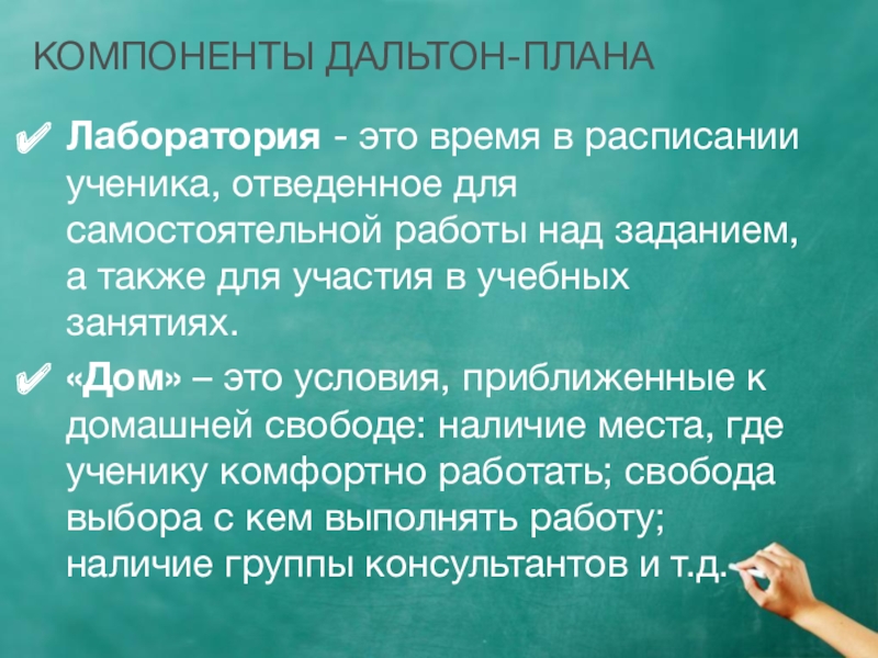 эти исходные позиции философии рассматриваемой технологии реализуются через ДАЛЬТОН-ПЛАН, включающий в себя задания, лабораторию и «дом».