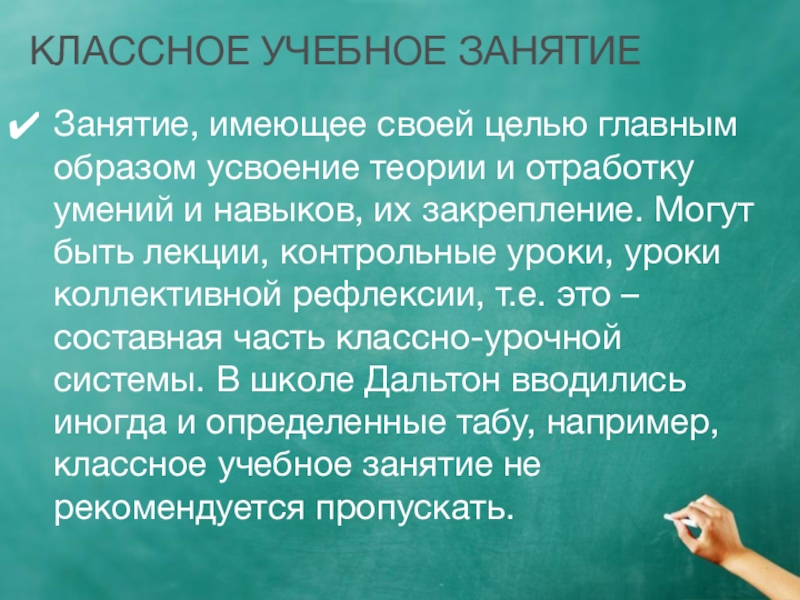отработку умений и навыков, их закрепление. Могут быть лекции, контрольные уроки, уроки коллективной рефлексии, т.е. это – составная часть классно-урочной системы. В школе Дальтон вводились иногда и определенные табу, например, классное учебное занятие не рекомендуется пропускать.