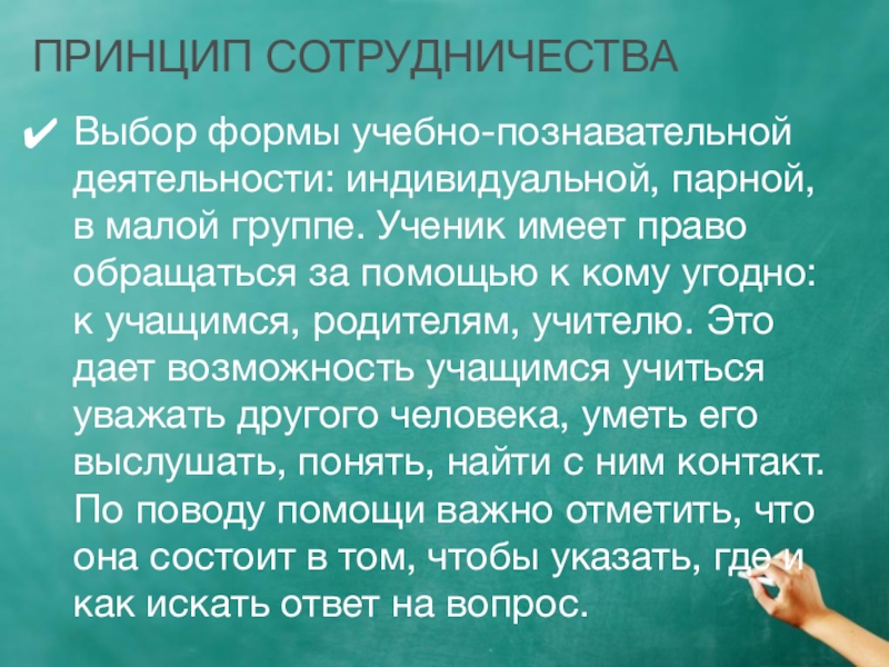 имеет право обращаться за помощью к кому угодно: к учащимся, родителям, учителю. Это дает возможность учащимся учиться уважать другого человека, уметь его выслушать, понять, найти с ним контакт. По поводу помощи важно отметить, что она состоит в том, чтобы указать, где и как искать ответ на вопрос.