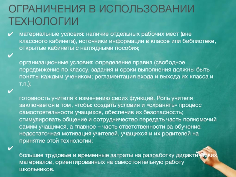 готовность учителя к изменению своих функций. Роль учителя заключается в том, чтобы: создать условия и «охранять» процесс самостоятельности учащихся, обеспечив их безопасность; стимулировать общение и сотрудничество передать часть полномочий самим учащимся, а главное – часть ответственности за обучение.