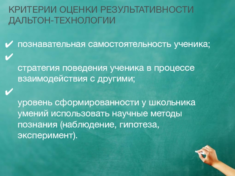 Слайд 17КРИТЕРИИ ОЦЕНКИ РЕЗУЛЬТАТИВНОСТИ ДАЛЬТОН-ТЕХНОЛОГИИ