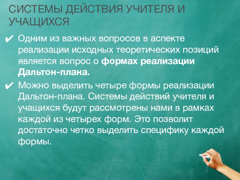 Можно выделить четыре формы реализации Дальтон-плана. Системы действий учителя и учащихся будут рассмотрены нами в рамках каждой из четырех форм. Это позволит достаточно четко выделить специфику каждой формы.