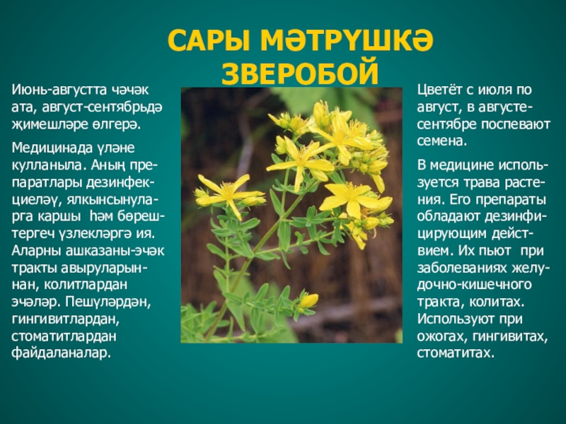 Как лекарство используется трава. Применяется как успокоительное средство, усиливает работу кишечника, бронхов. Исполь-зуют при бессон-нице, для повыше-ния аппетита, при гастрите.