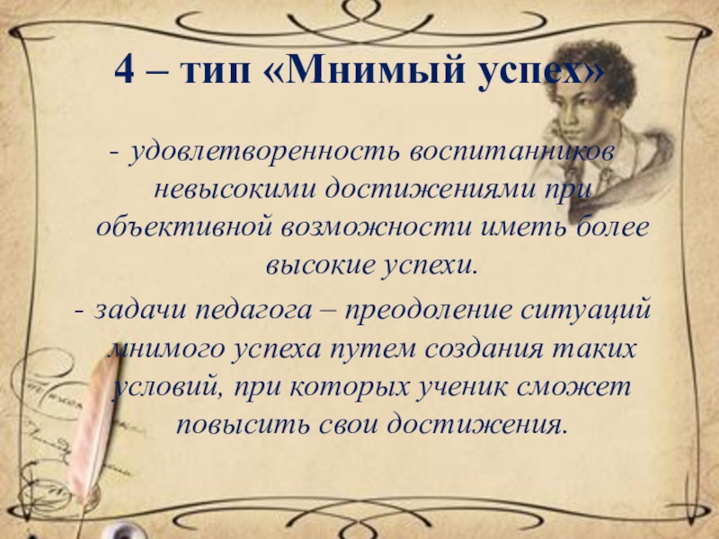 задачи педагога – преодоление ситуаций мнимого успеха путем создания таких условий, при которых ученик сможет повысить свои достижения.