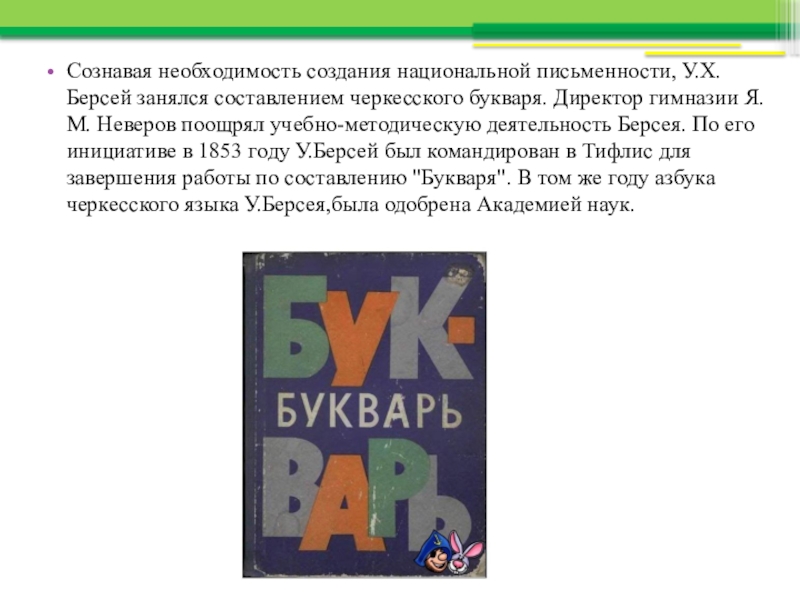 Слайд 14Сознавая необходимость создания национальной письменности, У.Х. Берсей занялся составлением черкесского букваря.